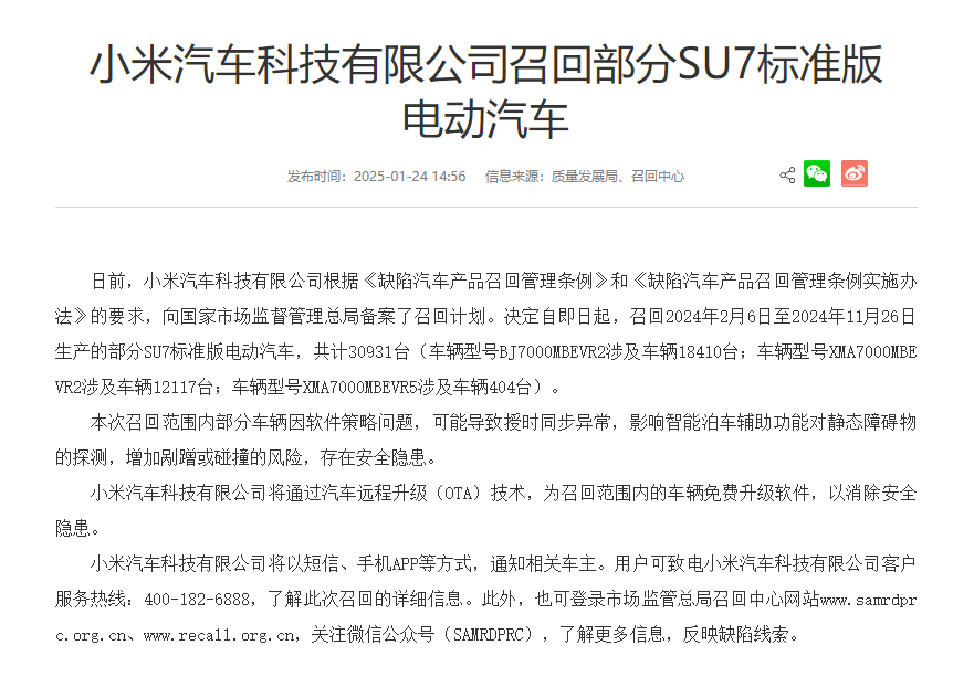 据市场监管总局网站24日消息,日前,小米汽车科技有限公司向国家市场监督管理总局备案了召回计划。决定自即日起,召回2024年2月6日至2024年11月26日生产的部分SU7标准版电动汽车,共计30931台。本次召回范围内部分车辆因软件策略问题,可能导致授时同步异常,影响智能泊车辅助功能对静态障碍物的探测,增加剐蹭或碰撞的风险,存在安全隐患。