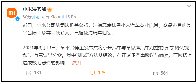 2024年8月13日,某平台博主发布其将小米汽车与某品牌汽车对撞的所谓“测试视频”,有意误导公众。其中“测试”方法及结论,存在诸多严重谬误与偏颇,在网络上造成极为恶劣的影响,严重损害小米公司商业信誉。事件发生后,小米公司立即固定证据,开展法律维权工作,坚决捍卫公司合法权益。
