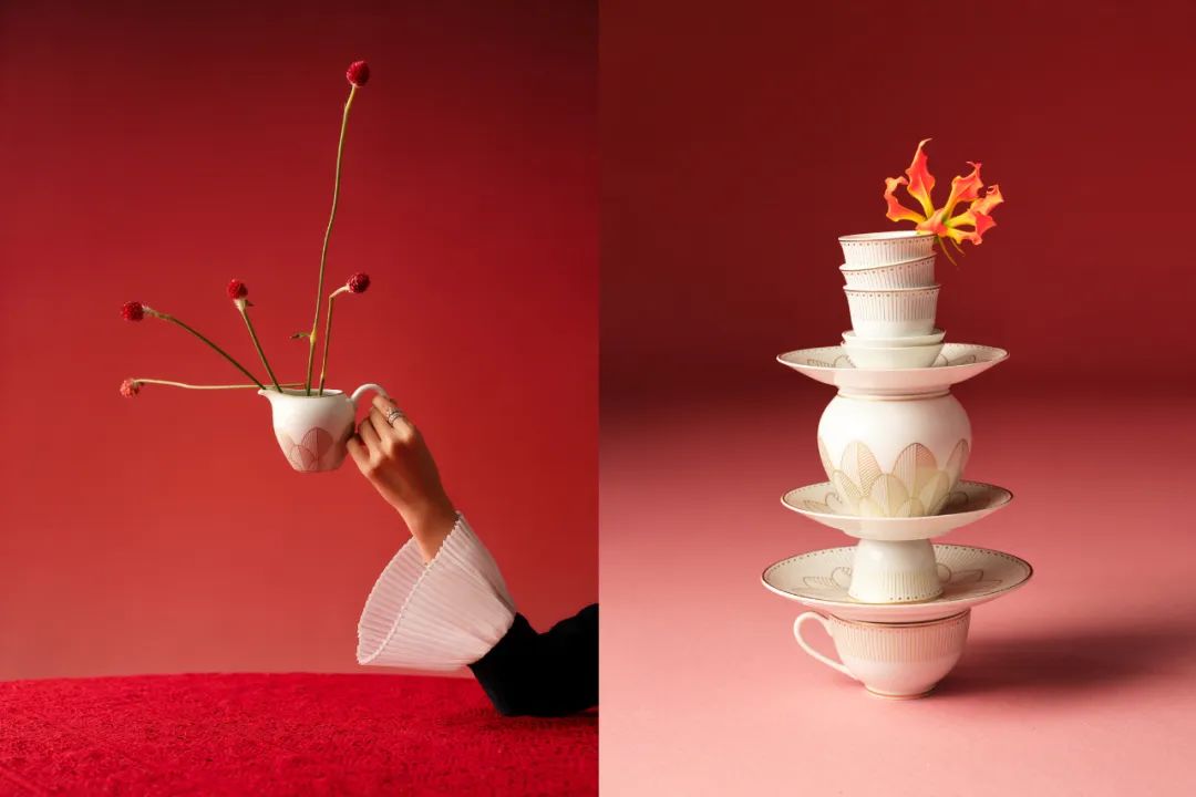 从经典多宝阁汲取灵感,SHANG XIA上下黑檀竹丝镶嵌茶棚以1cm纤细的黑檀材质为框架,朦胧而又富有光影变化的竹刻工艺,呈现玲珑剔透的轻盈美感;澄月系列礼盒以“月、香、茶”三重东方审美意象,融合三种经典盒形元素:手袋、提盒与多宝盒,玲珑别致;红竹丝扣瓷茶具套装,采用“双线交叉走丝”的立体编织工艺,将竹子劈成细丝,紧贴1300度以上高温烧制的瓷面编织,竹编的每一处接头藏而不露。巧夺天工间,茶器也因竹编更具保温隔热的功能,忠实还原茶的本味。器型则延续古代经典“桥形钮,象征人与人、传统与现代的联结和对话,希冀借由器物的温度跨越时空阻隔,达成彼此间的畅然理解。