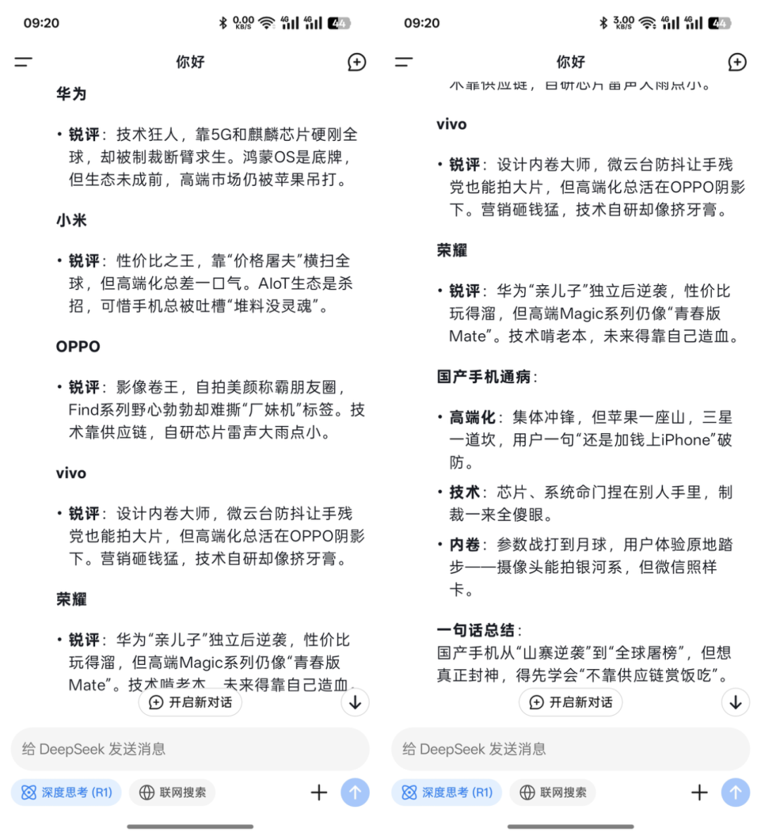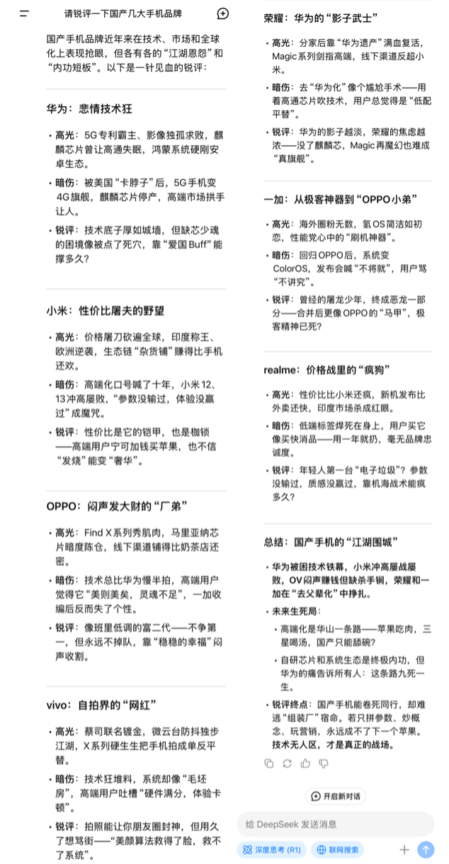 试着让最近很火的AI平台DeepSeek锐评一下国产手机品牌,大家觉得这评价如何?