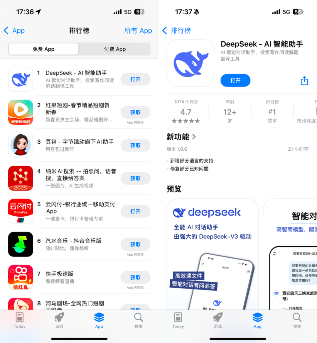 如上图所见,近日深度求索旗下AI智能助手应用DeepSeek登顶苹果App Store免费应用榜,相关界面显示,DeepSeek AI助手使用一经开源即在海内外引起震动、总参数超600B的DeepSeek-V3大模型,多项性能指标对齐海外顶尖模型,支持智能对话、AI搜索、深度思考、文件上传等功能,用更快的速度、更加全面强大的功能为用户答疑解惑,助力高效美好的生活。