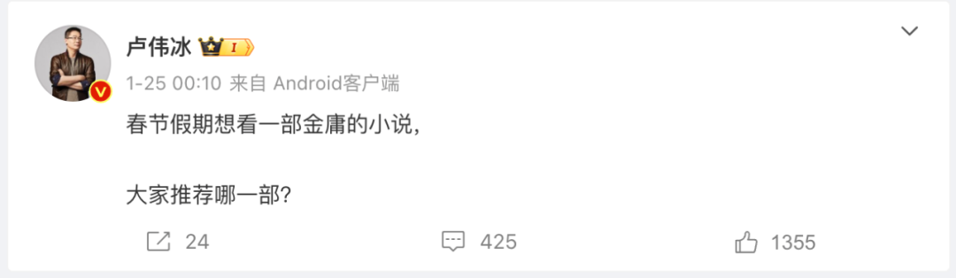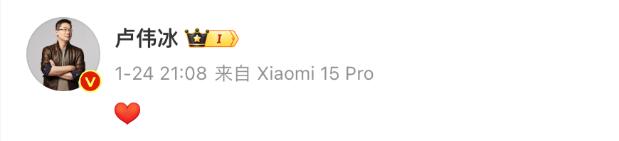 最后就是小米这边的消息了。此前消息称小米15 Ultra预计2月中下旬发布,将是年后这批超大杯旗舰中首台登场的影像旗舰,最近我们注意到小米卢伟冰微博来源还变成了“Android客户端”,猜测或许是已经换上了新机在尝鲜使用。