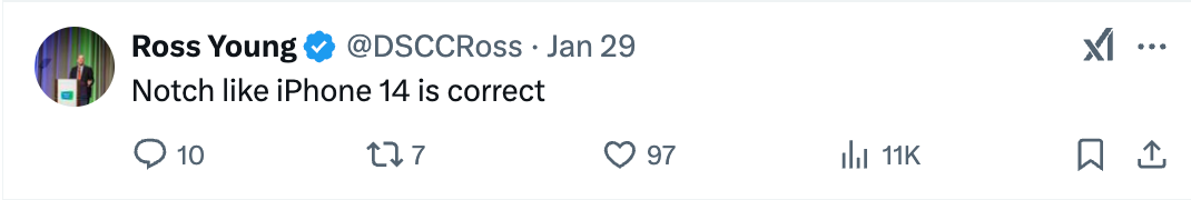 昨日屏幕供应链咨询公司DSCC首席执行官Ross Young发文回复之前说是灵动岛的爆料,称:苹果即将推出的iPhone SE 4配备和iPhone 14同款刘海屏幕才是正确的,并非灵动岛挖孔屏。