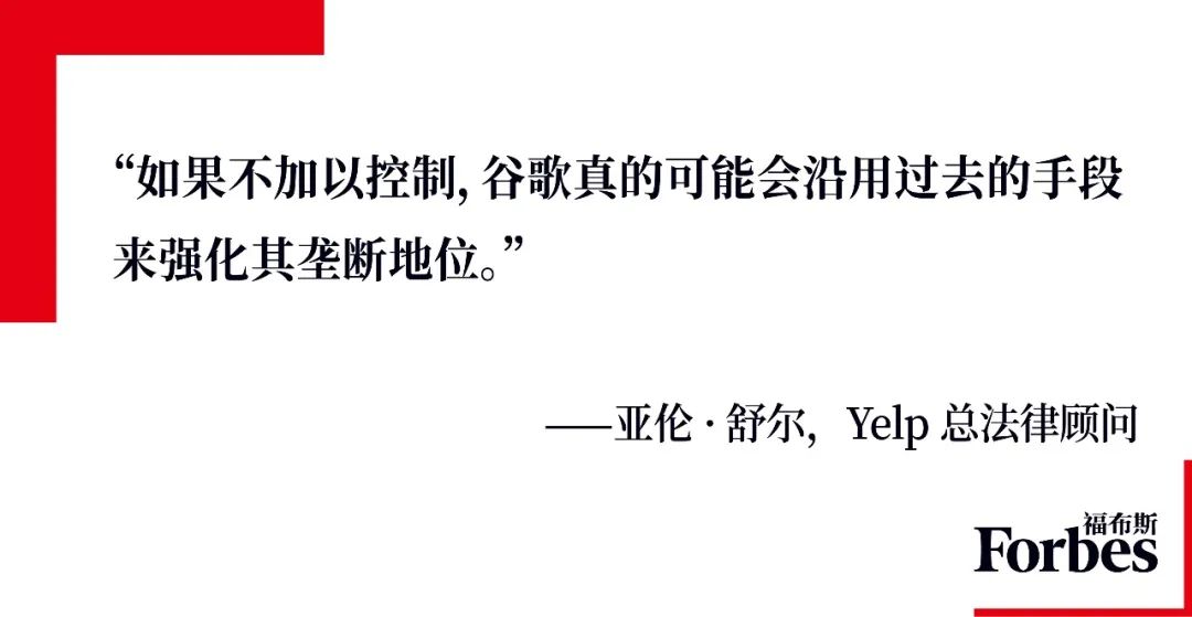 Yelp总法律顾问亚伦·舒尔(Aaron Schur)补充说,搜索领域推进人工智能的做法引发了人们由来已久的对反垄断问题的担忧。“如果不加以控制,谷歌真的有可能会沿用过去的手段来强化其垄断地位,”他说。