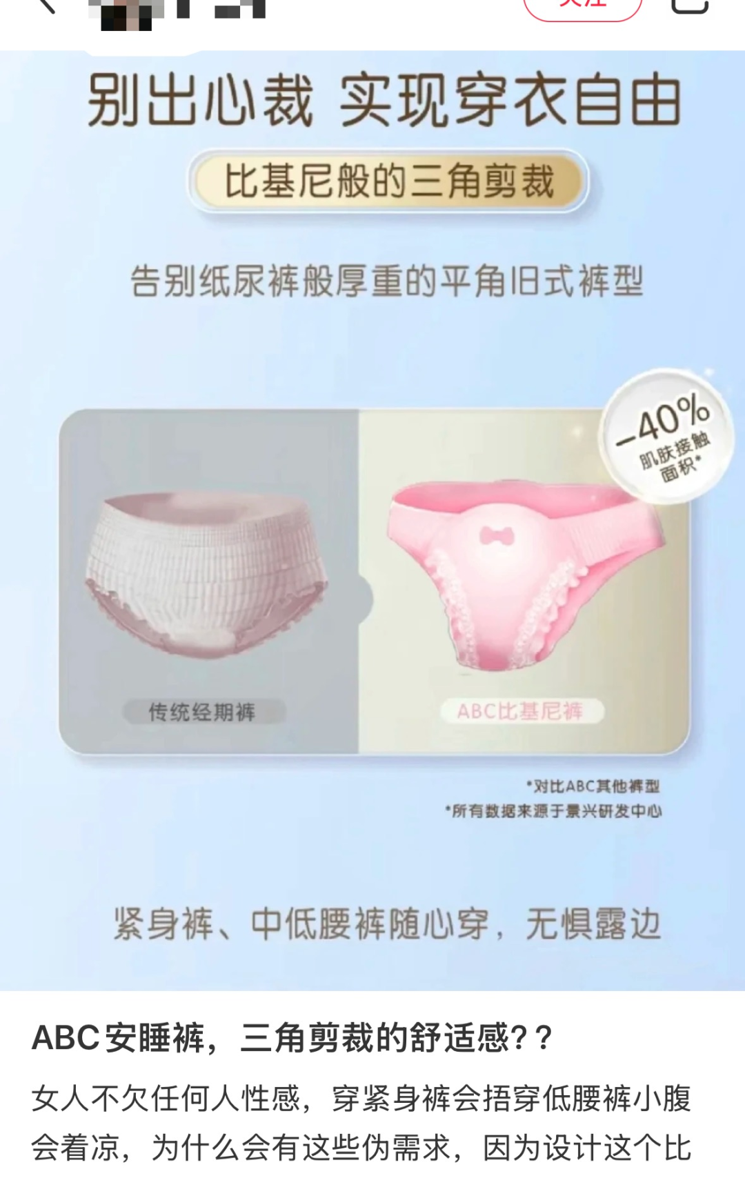 近日有市场消息称,ABC推出了一款比基尼安睡裤。网传的宣传图显示,该产品采用比基尼般的三角剪裁,减少40%肌肤接触面积,并打出“实现穿衣自由”“无惧漏边”的口号。