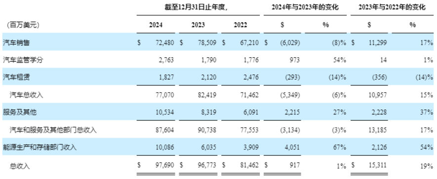 分业务来看,特斯拉来自车辆的营收为770.7亿美元,较上年同期下降6%;来自储能的营收为100.86亿美元,较上年同期增长67%;来自服务的营收为105.34亿美元,较上年同期增长27%。不难看出,特斯拉储能以及服务板块全年营收仍保持着较快的增长,但汽车这一核心业务销售收入的下滑最终导致其2024年全年业绩不及市场预期。