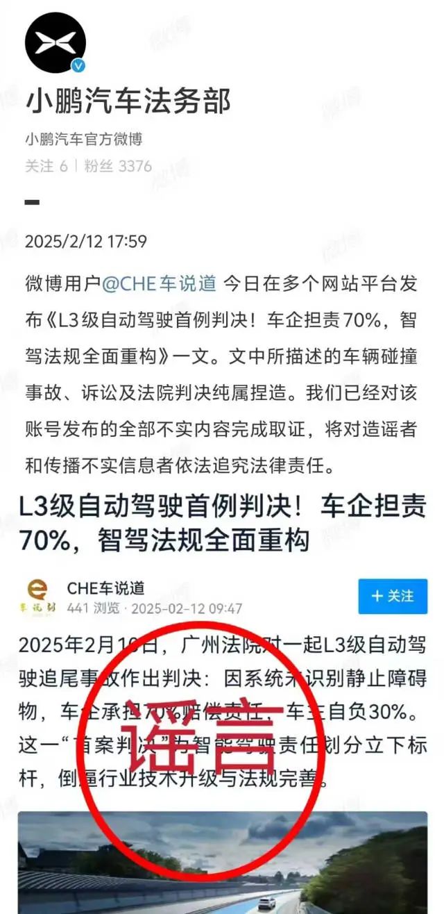 2月17日,小鹏汽车法务部在微博发文称,2月13日,小鹏汽车就有人在网络上造谣“L3级自动驾驶首例判决”向公安机关报案,现案件已侦破,主要犯罪嫌疑人涉嫌寻衅滋事罪已到案。目前该案件仍在继续侦办中。