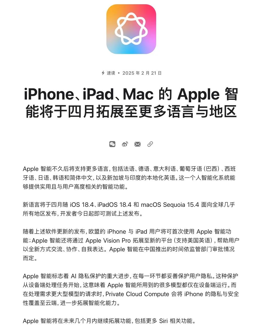 如上图所见,苹果中国官网昨日更新了新闻稿,表示Apple智能将于4月拓展至更多语言与地区。官方表示:“Apple智能不久后将支持更多语言,包括法语、德语、意大利语、葡萄牙语(巴西)、西班牙语、日语、韩语和简体中文,以及新加坡与印度的本地化英语。新语言将于4月随iOS 18.4、iPadOS 18.4和macOS Sequoia 15.4面向全球几乎所有地区发布,开发者2月21日起即可测试上述发布。”