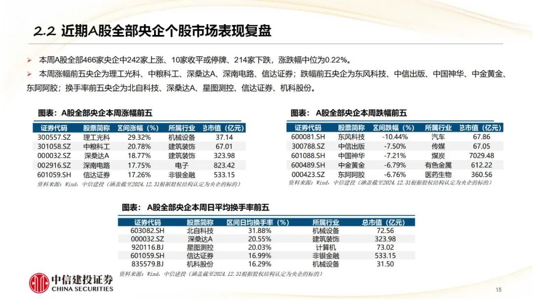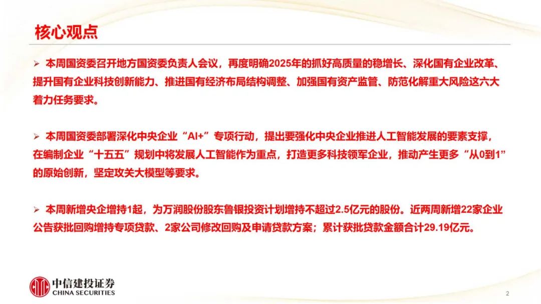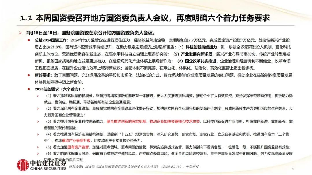 本周国资委召开地方国资委负责人会议,再度明确2025年的抓好高质量的稳增长、深化国有企业改革、提升国有企业科技创新能力、推进国有经济布局结构调整、加强国有资产监管、防范化解重大风险这六大着力任务要求。