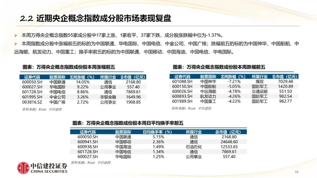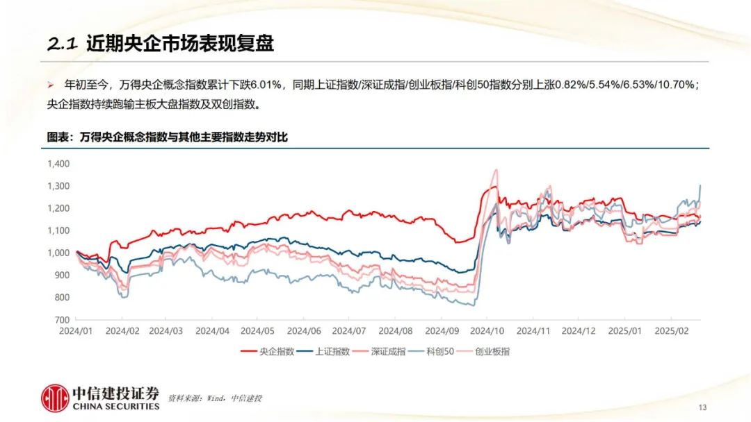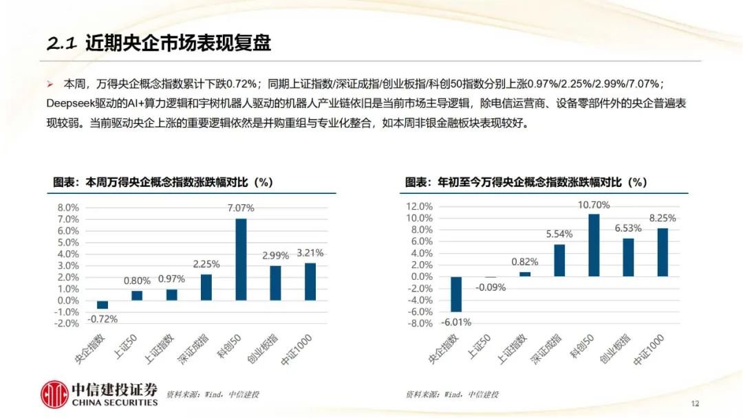 市场表现:本周,万得央企概念指数累计下跌0.72%;同期上证指数/深证成指/创业板指/科创50指数分别上涨0.97%/2.25%/2.99%/7.07%;Deepseek驱动的AI+算力逻辑和宇树机器人驱动的机器人产业链依旧是当前市场主导逻辑,除电信运营商、设备零部件外的央企普遍表现较弱。当前驱动央企上涨的重要逻辑依然是并购重组与专业化整合,如本周非银金融板块表现较好。年初至今,万得央企概念指数累计下跌6.01%,同期上证指数/深证成指/创业板指/科创50指数分别上涨0.82%/5.54%/6.53%/10.70%;央企指数持续跑输主板大盘指数及双创指数。