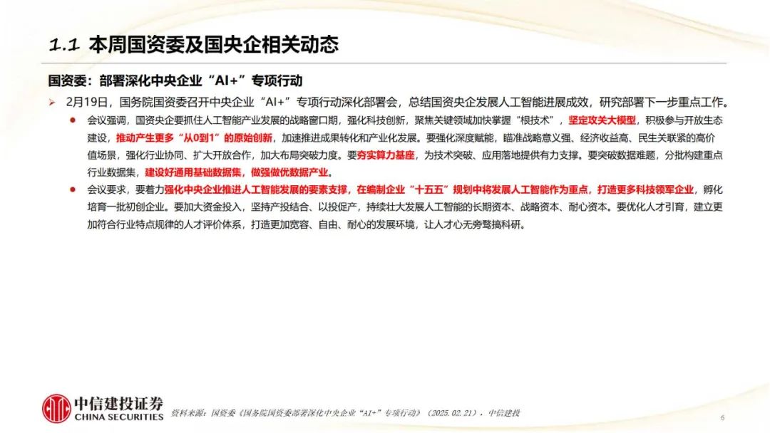 本周国资委部署深化中央企业“AI+”专项行动,提出要强化中央企业推进人工智能发展的要素支撑,在编制企业“十五五”规划中将发展人工智能作为重点,打造更多科技领军企业,推动产生更多“从0到1”的原始创新,坚定攻关大模型等要求。