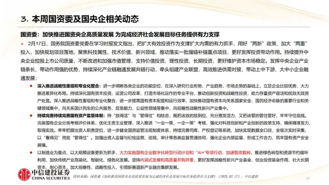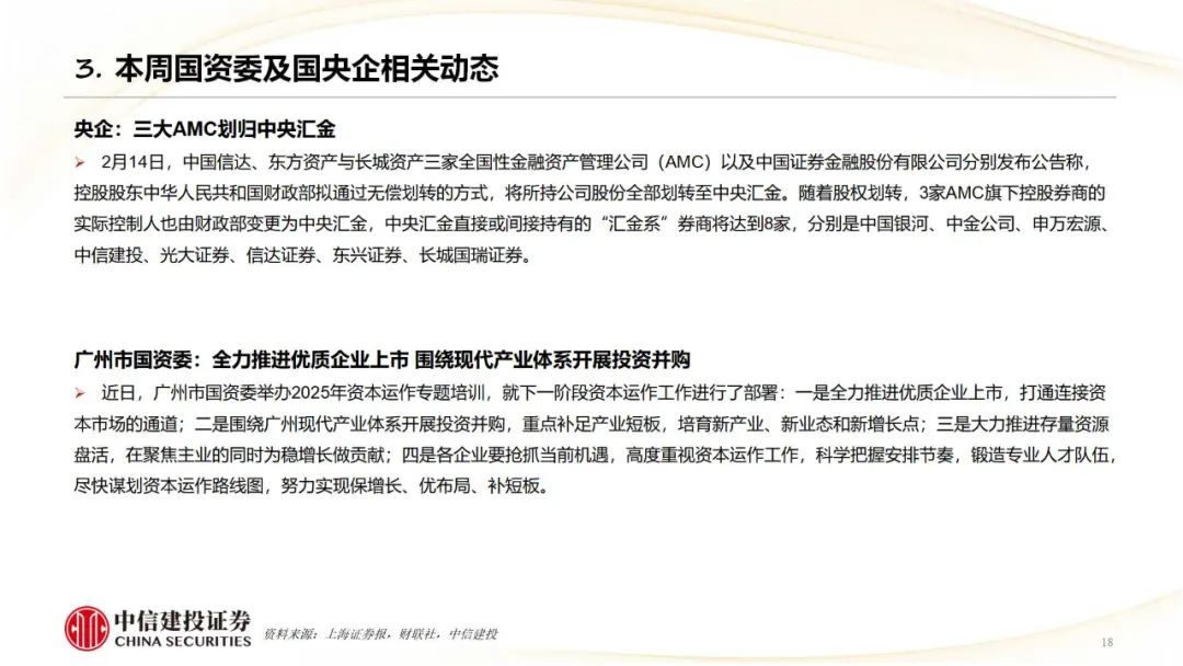 本周国资央企动态:2月17日,国务院国资委党委在学习时报发文指出,把扩大有效投资作为支撑扩大内需的有力抓手,用好“两新”政策、加大“两重”投入,加快规划项目落地,聚焦科技属性、技术价值、新兴领域,推动落实一批强链补链重点项目,更好发挥投资带动作用。持续提升中央企业控股上市公司质量,不断改进和加强市值管理,支持价值投资、理性投资、长期投资,更好维护资本市场稳定。2月14日,中国信达、东方资产与长城资产三家全国性金融资产管理公司(AMC)以及中国证券金融股份有限公司分别发布公告称,控股股东中华人民共和国财政部拟通过无偿划转的方式,将所持公司股份全部划转至中央汇金。