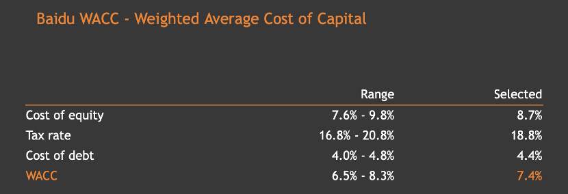 如果说ROIC所表达的是企业投入资金的回报率,那么WACC就是企业所投入资金的融资成本(加权平均资本成本),根据valueinvesting.io计算,百度的WACC大概在7.4%左右,几乎与ROIC相当。