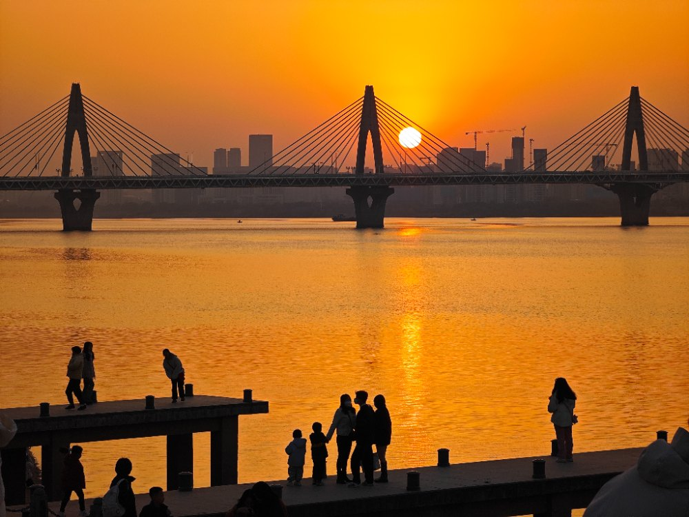 赣江将晚霞揉成粼粼金箔时,堤岸铺开了慵懒的长卷。我和朋友漫步其中,被暮色吸引,所有人都在享受这唯美的时刻,远处的大桥与楼房成为取景框中的背景,近处的人们笑着走着,一同绘就了这琥珀色的黄昏。