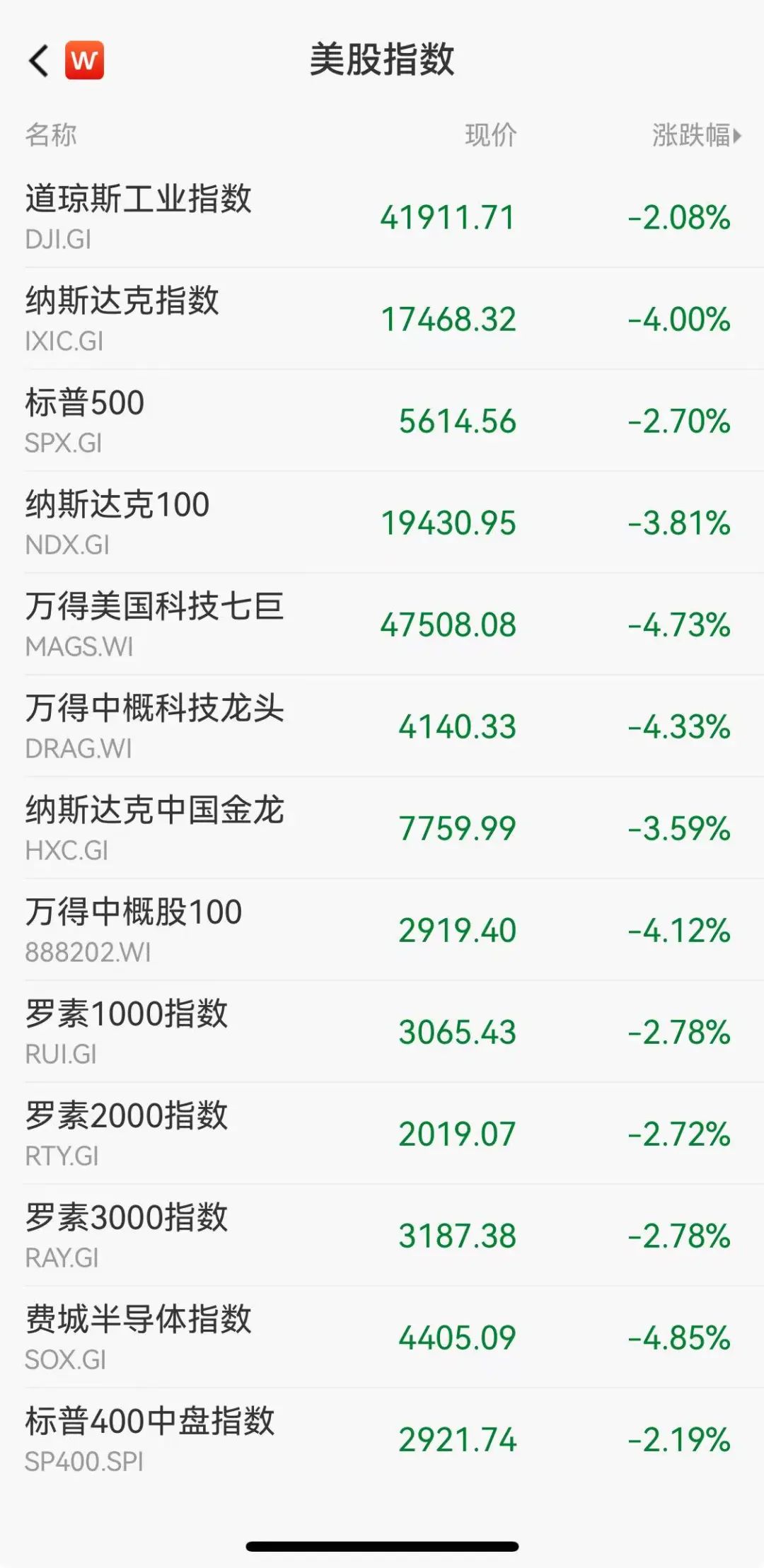 万得美国科技七巨头指数跌4.73%。特斯拉跌超15%,英伟达跌逾5%,苹果跌超4%,谷歌跌逾4%,脸书跌超4%,微软跌逾3%,亚马逊跌超2%。