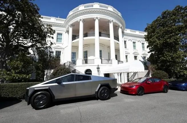 当地时间11日,包括Model S、Cybertruck和Model Y等多种特斯拉电动汽车停在白宫外。图源:英媒