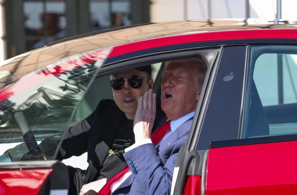 当地时间11日,特朗普与马斯克在特斯拉Model S电动汽车内。图源:英媒
