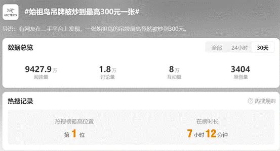 近日,一张成本不足1元的始祖鸟吊牌,在二手平台被炒至300元,甚至超越部分成衣价格,登上微博热搜榜首,近8万人参与互动。