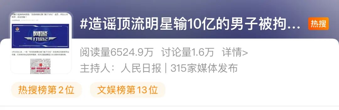 造谣顶流明星输10亿的男子被拘留