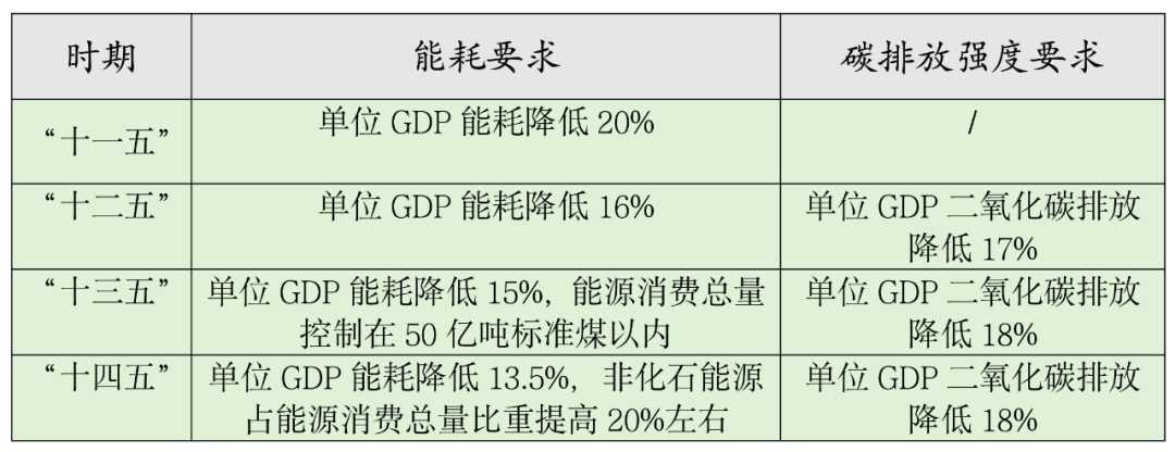 单位GDP能耗降低作为约束性指标,首先被纳入国家“十一五”规划;随后,“十二五”规划在把单位GDP能耗降低作为约束性指标的同时,提出合理控制能源消费总量的要求。进入“十三五”时期后,国家实施了能耗总量和强度双控行动,国务院将全国双控目标分解到了各地区,对双控工作进行了全面部署。进入“十四五”时期后,双控目标再一次分解到各地区执行。