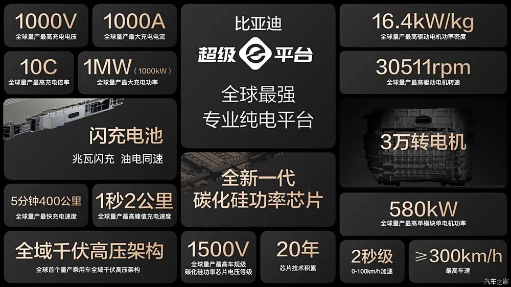 比亚迪超级e平台将配备闪充电池,碳化硅功率芯片和3万转电机,0-100km/h加速达到2秒级,最高车速超过300km/h。比亚迪超充定名兆瓦闪充,液冷充电系统最大功率1360千瓦,占地面积小仅1.5平米,全球建设超过4000个闪充桩。超级e平台实现1秒钟充电2公里,5分钟充电400km,将实现1000V最高充电电压,1000A最大充电电流,10C最高充电倍率,1000千瓦充电功率。同时,全面兼容公共充电桩,双枪可实现500千瓦充电。