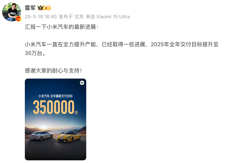 而今天下午,雷军更新了目标,表示小米汽车一直在全力提升产能,已经取得一些进展,2025年全年交付目标提升至35万台。大家看好这个目标吗?