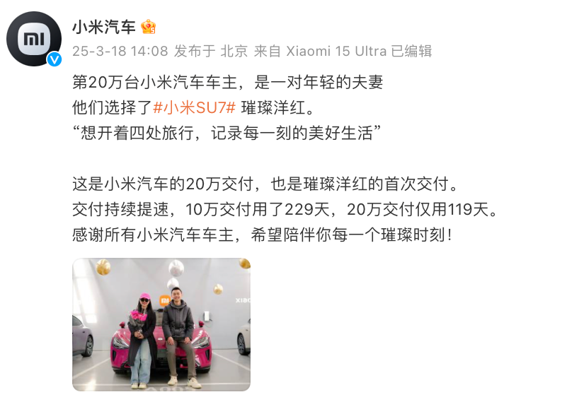 如上图所见,官方宣布今日小米汽车完成了第20万辆的交付,第一个“10万辆交付”用时229天,而从10万辆到完成第20万辆,第二个“10万辆交付”用时119天,交付持续提速。
