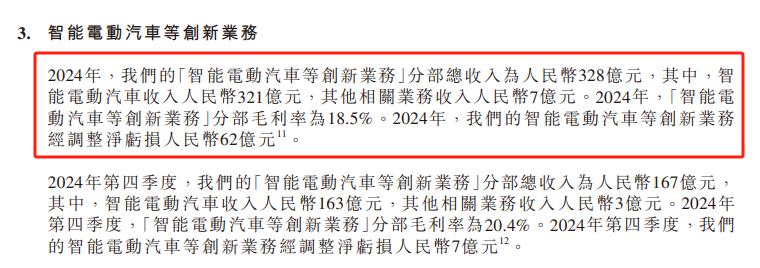 小米集团在财报中称,2024年,智能电动汽车分部收入为328亿元,其中,智能电动汽车收入321亿元,其他相关业务收入7亿元,毛利率为18.5%。经调整,净亏损人民币62亿元。第四季度,智能电动汽车等创新业务分部毛利率为20.4%。此外,2024年第四季度,智能电动汽车等创新业务经调整净亏损人民币7亿元。