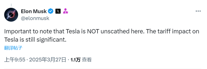 当地时间3月26日,美国总统特朗普在白宫签署行政令,宣布对所有进口汽车征收25%关税。马斯克稍后在社交平台X上发帖回复一位用户时称,“值得注意的是,特斯拉并非毫发无损。关税对特斯拉的影响仍然重大”。