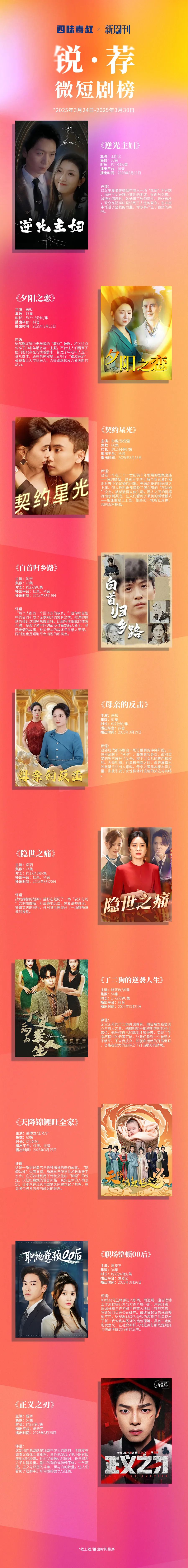 本次「锐·荐微短剧榜」周榜第六期(2025年3月24日——2025年3月30日)