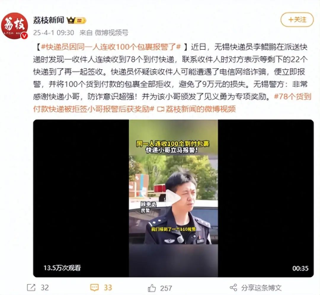 无锡警方:非常感谢快递小哥,防诈意识超强!并为该小哥颁发了见义勇为专项奖励。