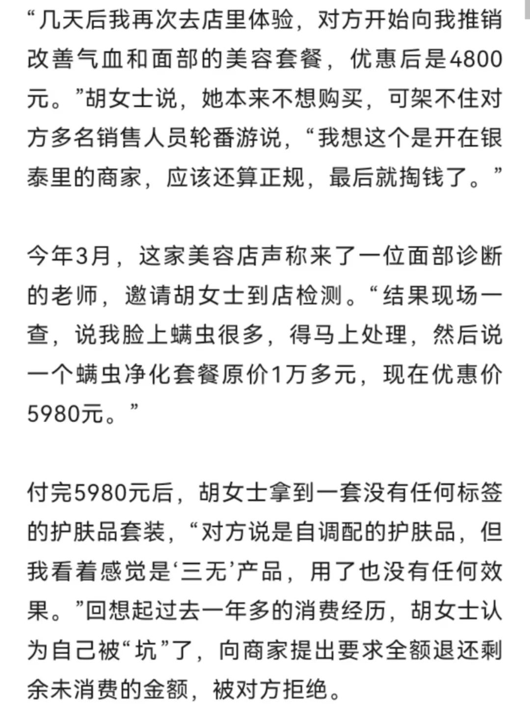 “开在银泰城里的美容店这么不靠谱,给顾客使用没有标签的‘三无’化妆品。”日前,浙江温州市苍南消费者胡女士(化姓)反映,她在体验一次“免费美容”时,在美容店的连环诱导下先后充值约2.1万元。