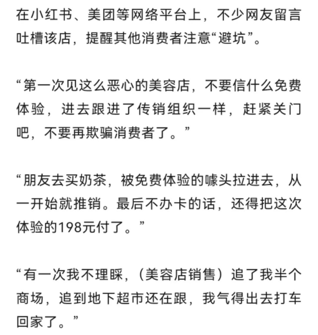 去年3月,胡女士在逛苍南银泰城时,遇到慕琳科技美肤门店销售人员现场发放免费美容体验卡。“销售人员特别热情,拉着我去试一试,说是免费的。”胡女士说,出于礼貌她就跟着销售去店内体验,“做完美容之后,销售人员提出让我付几十元,还可以锁定下一次的体验。因为金额不多,我就同意了。”