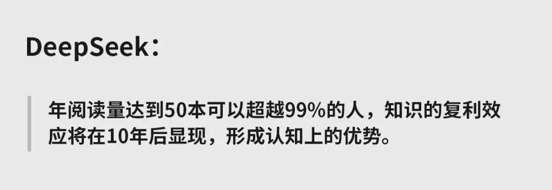 “年阅读量达到50本可以超越99%的人,知识的复利效应将在10年后显现,形成认知上的优势。”