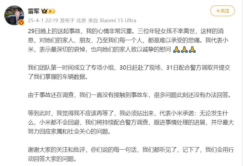29日晚上的这起事故,我的心情非常沉重。三位年轻女孩不幸离世,这样的消息,对她们的家人、朋友,乃至我们每一个人,都是难以承受的悲痛。我代表小米,表示最深切的哀悼,也向她们的家人致以诚挚的慰问 。