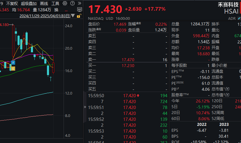 当地时间4月1日(周二),美国三大股指收盘涨跌不一,中概股多数上涨,其中激光雷达龙头禾赛科技暴涨逾17%。