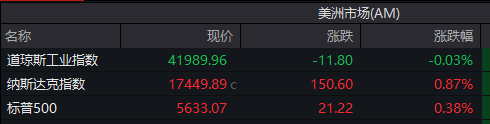 当地时间周二,美国三大股指收盘涨跌不一,其中,道琼斯工业指数微幅下跌0.03%,报41989.96点;标普500指数小幅上涨0.38%,报5633.07点;纳斯达克指数上涨0.87%,报17449.89点。
