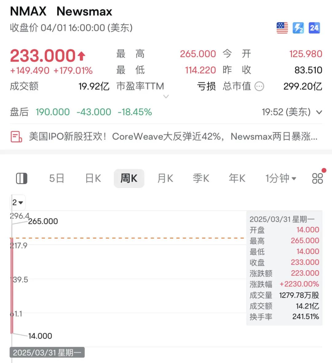 值得一提的是,媒体公司Newsmax上市次日股价再度大涨近180%,股价报233美元/股,总市值近300亿美元,该股上市两天已累计上涨2230%。