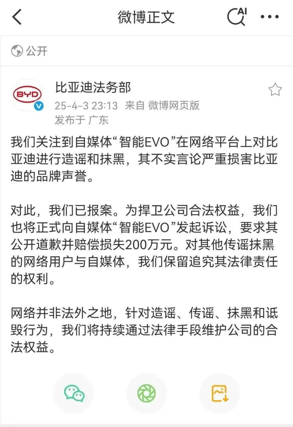 4月3日深夜,比亚迪法务部官微发文: