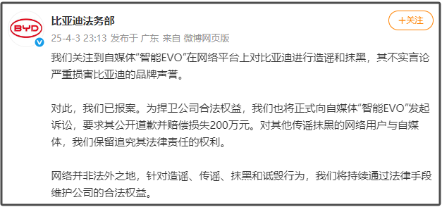 4月3日深夜,比亚迪法务部官方微博发文表示,向自媒体“智能EVO”发起诉讼,要求其公开道歉并赔偿损失200万元。