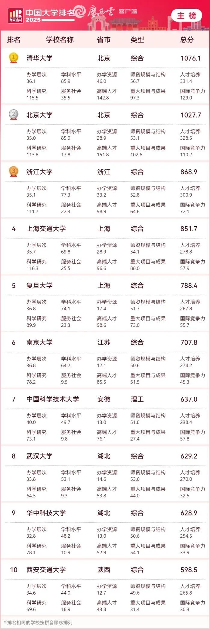 “2025软科中国大学排名”的对象是我国1000多所本科层次的高校,为恰当反映高校在学校性质和学校类型上的差异、确保排名的公平性,软科将高校划分为综合性大学、8类单科性大学、4类非公办大学,采用差异化的指标体系分别排名。此次榜单中,清华大学、北京大学、浙江大学稳居主榜前三位。北京协和医学院拔得医药类大学排名头筹,北京中医药大学位列中医药大学排名第一,上海财经大学名列财经类大学排名首位,北京外国语大学摘得语言类大学排名桂冠,中国政法大学荣登政法类大学排名榜首,中央民族大学位列民族类大学排名第一,上海体育大学领跑体育类大学排名,香港中文大学(深圳)夺得中国合作办学大学排名魁首。