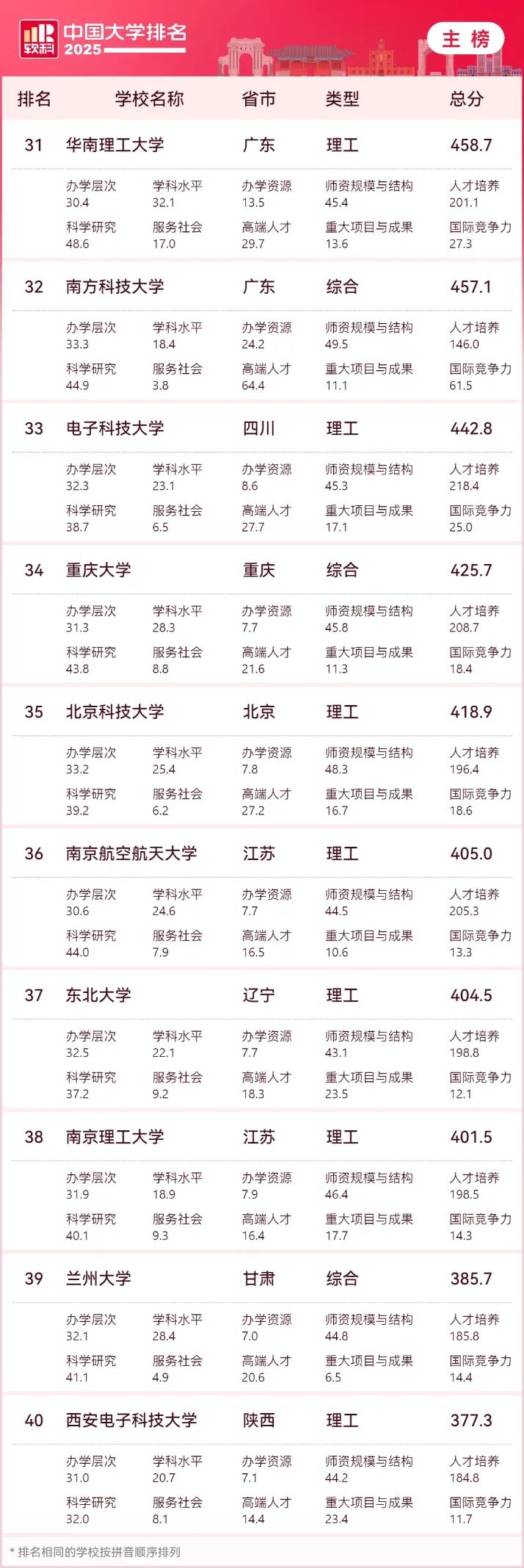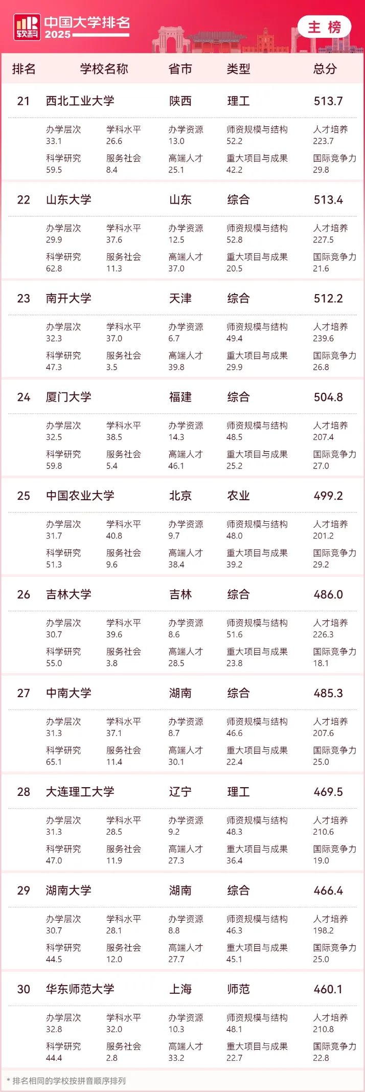 排名中,“双一流”建设高校持续保持优势,全国百强高校中有91所为“双一流”高校。主榜上,上海交通大学、复旦大学处于全国前5名之列,双双领跑上海高校。其后,其他位列全国前十名的大学依次为南京大学(第六)、中国科学技术大学(第七)、武汉大学(第八)、华中科技大学(第九)、西安交通大学(第十)。