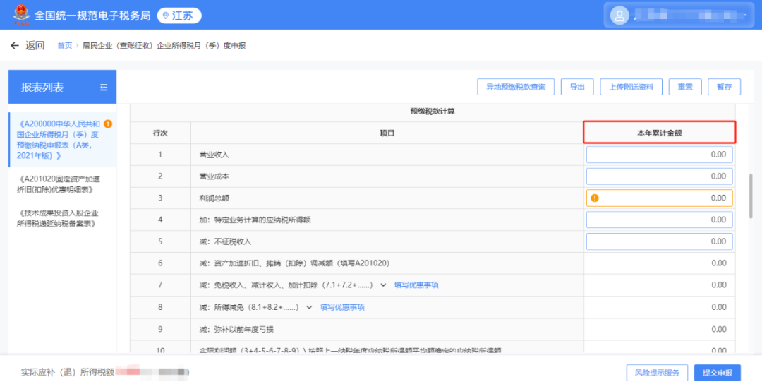 预缴纳税申报表需要填写的是“本年累计金额”。其中,一季度预缴纳税申报时本季度金额与本年累计金额一致,二季度及之后季度预缴纳税申报时要特别注意,需要填报的是本年累计金额。