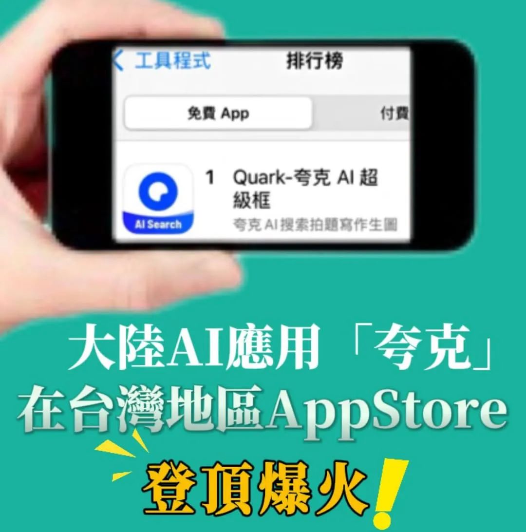 据台媒报道,苹果应用商店数据近日显示,大陆AI应用夸克持续霸榜台湾地区App Store工具排行榜第一名,并冲上App Store免费榜第二名,成为台湾民众新晋潮流App,引发岛内舆论热议。
