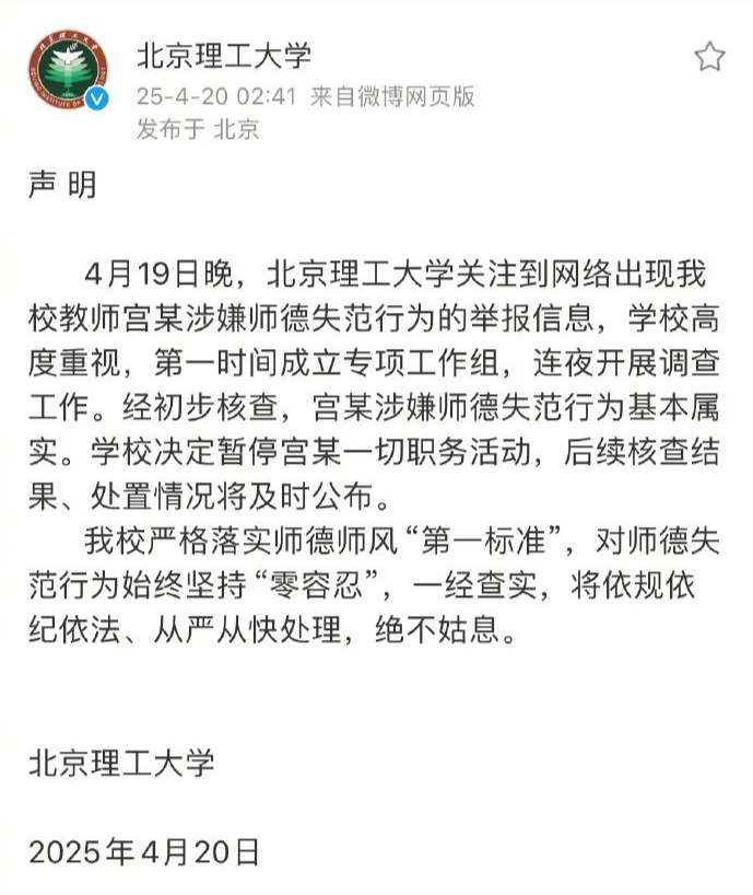 4月19日晚,北京理工大学关注到网络出现我校教师宫某涉嫌师德失范行为的举报信息,学校高度重视,第一时间成立专项工作组,连夜开展调查工作。经初步核查,宫某涉嫌师德失范行为基本属实。学校决定暂停宫某一切职务活动,后续核查结果、处置情况将及时公布。