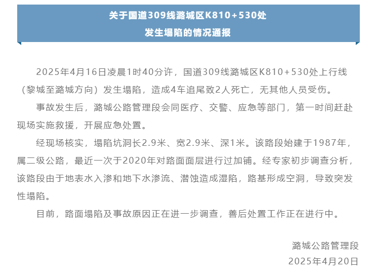 4月20日,山西省潞城公路管理段发布通报,4月16日凌晨1时40分许,国道309线山西省长治市潞城区K810+530处上行线(黎城至潞城方向)发生塌陷,造成4车追尾致2人死亡,无其他人员受伤。