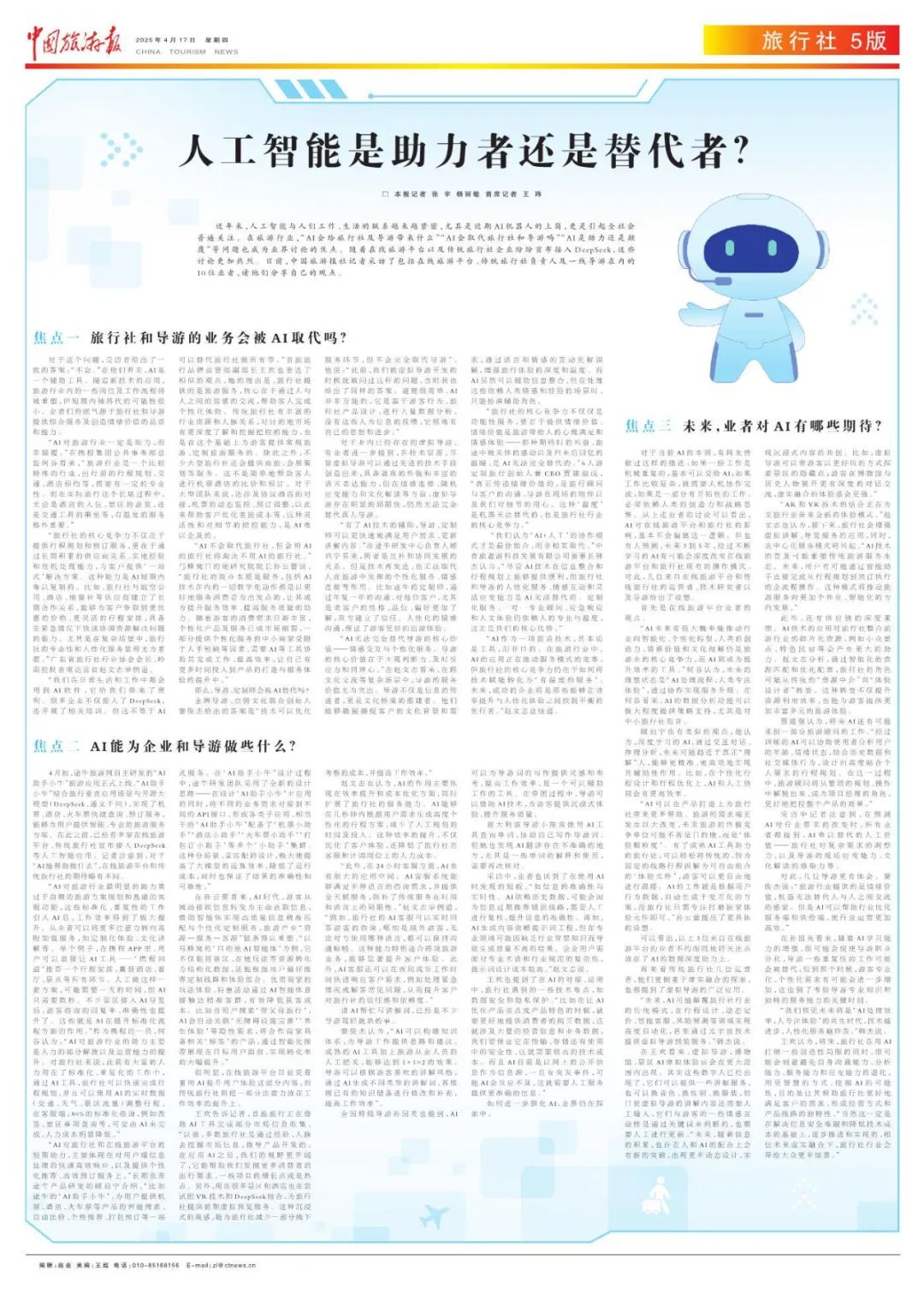 近年来,人工智能与人们工作、生活的联系越来越紧密,尤其是近期AI机器人的上岗,更是引起全社会普遍关注。在旅游行业,“AI会给旅行社及导游带来什么”“AI会取代旅行社和导游吗”“AI是助力还是颠覆”等问题也成为业界讨论的焦点。随着在线旅游平台以及传统旅行社企业纷纷宣布接入DeepSeek,这些讨论更加热烈。日前,中国旅游报社记者采访了包括在线旅游平台、传统旅行社负责人及一线导游在内的10位业者,请他们分享自己的观点。