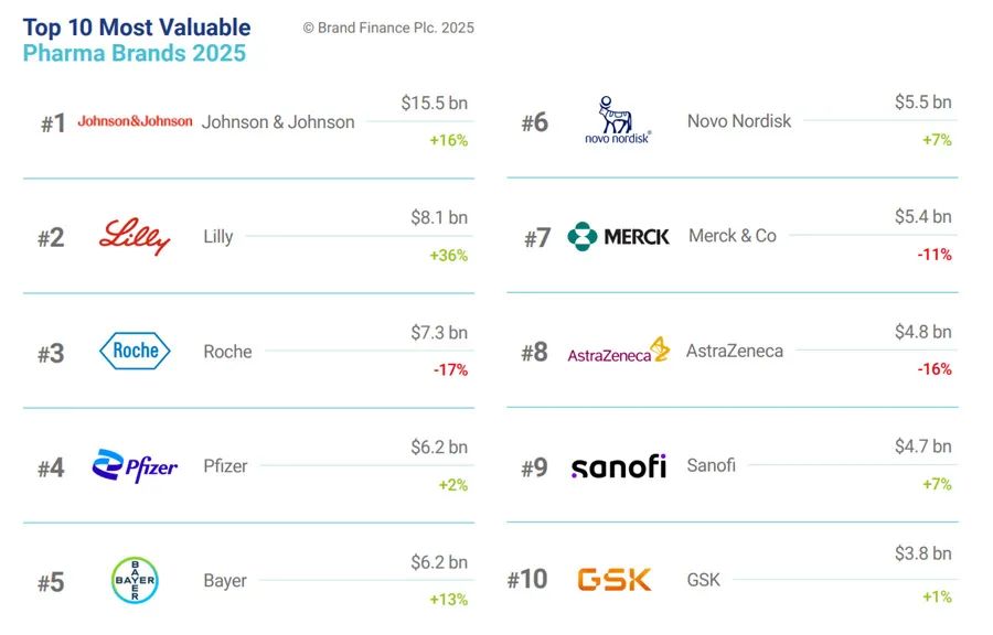 英国品牌评估机构“品牌金融”(Brand Finance)发布2025“全球医疗保健品牌”价值榜(Healthcare 2025)。在“全球制药品牌价值25强”(Pharma 25)榜单上,强生、礼来、罗氏名列前三位。中国有3个品牌上榜。