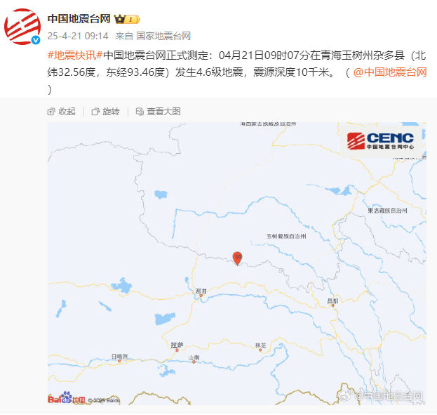4月21日,中国地震台网正式测定:4月21日9时7分在青海玉树州杂多县(北纬32.56度,东经93.46度)发生4.6级地震,震源深度10千米。