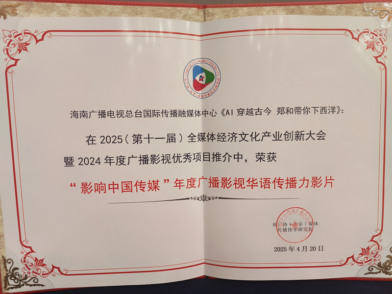 大会期间,“'影响中国传媒'2024年度广播影视优秀项目推介盛典”备受瞩目。自2025年2月启动作品征集,大会组委会共收到来自20多个省、直辖市、自治区的广播影视机构、高校及新媒体业界作品近500件,最终有20家机构、80个项目及25个人物在推介盛典揭晓并获得推介与展示。其中,海南广播电视总台国际传播融媒体中心成绩亮眼,其举办的《2024年时尚生活暨高定艺术展》荣获“‘影响中国传媒’年度广播影视创新活动”奖项 ,制作的《AI穿越古今 郑和带你下西洋》影片荣获“‘影响中国传媒’年度广播影视华语传播力影片”奖项。这不仅是对海南广电国际传播融媒体中心过去一年工作的高度肯定,也凸显其在广播影视领域的创新探索与成果。